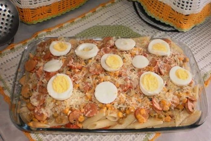 Em um refratário passe levemente margarina e despeje uma porção do macarrão, espalhe o molho em cima, bem servido, e um pouco do queijo ralado, cubra novamente com o macarrão e repita o mesmo processo, em cima do queijo espalhe os ovos cozidos cortados cuidadosamente em rodelas para decorar.