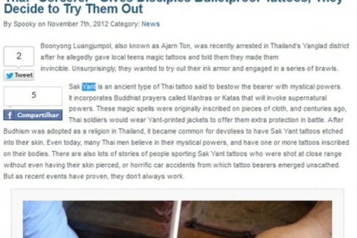 A polícia de Yanglad, distrito da Tailândia, prendeu um tatuador depois de o homem afirmar que suas tatuagens tinham poderes mágicos, e que os desenhos tornavam os jovens invencíveis, afirmação que acabou deixando diversos clientes feridos.