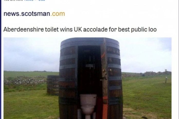 Um banheiro público construído em um barril de uísque ganhou o prêmio de mais criativo do Reino Unido, segundo reportagem do jornal "Scotsman". O banheiro curioso foi construído pelo casal Matthew e Carol Short, que mora na cidade de Fraserburgh.