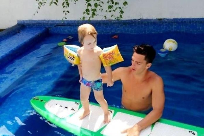 Amauri Nunes, namorado de Danielle Winits, aproveitou o dia de calor intenso para brincar com o filho caçula da atriz, Guy, na piscina. Ele postou uma foto sua com o menino, nesta quarta-feira, 26, em seu Twitter, e escreveu: "#SurfingClass @LaWinits & #Guy". Fofo!