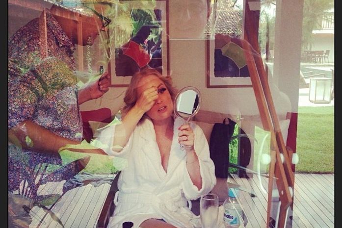 Angélica está voltando ao batente com garra depois do nascimento da terceira filha, Eva. Na manhã deste domingo, 13, o marido, Luciano Huck, postou uma foto em seu perfil na rede social Twitter, em que faz uma brincadeira com a mulher. "Janela indiscreta. Minha @angelicaksy maquiando para gravar", disse o apresentador, que flagrou a loira de forma que ele também aparecesse no registro, sorrindo, no reflexo do vidro que os separava.