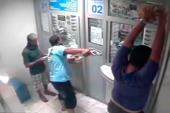 O vídeo do circuito interno da lotérica mostra que um dos assaltantes rende o segurança às 18 horas, entra na loteria e entrega o rapaz ao criminoso que estava na fila.