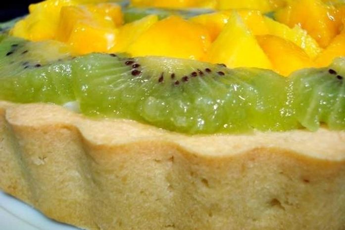 Com a massa já assada, recheie com o creme gelado e os kiwis cortados em rodelas e a manga em cubinhos, pincele a geléia de brilho. Sirva gelada!