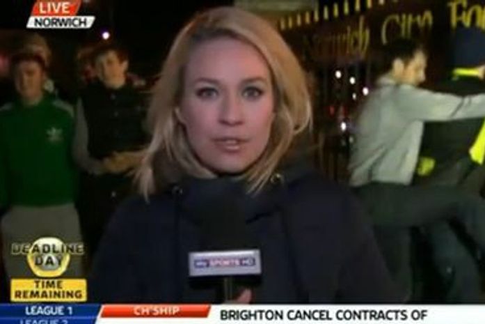 Torcedores do Norwich, da Inglaterra, aprontaram poucas e boas frente às câmeras da Sky Sports, canal inglês que estava cobrindo o último dia da janela de transferências. Enquanto a repórter Kate Riley dava informações sobre as últimas movimentações do time no mercado, dois rapazes simularam ato sexual em frente aos portões do clube.