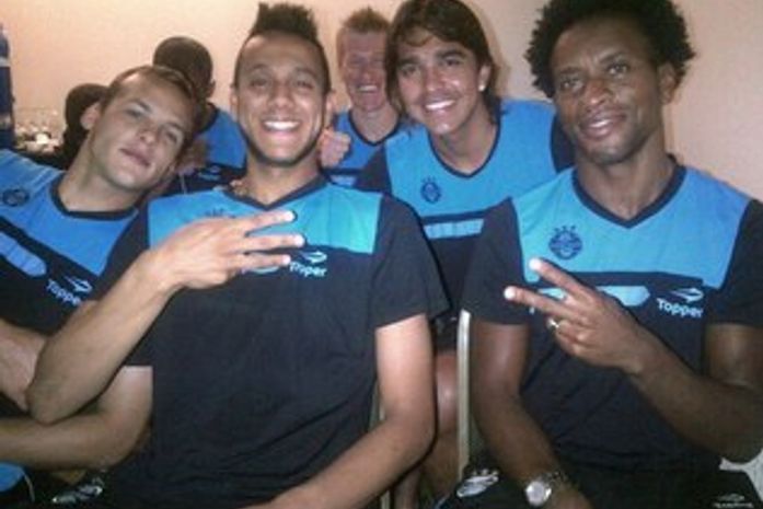 "Gremio até 2015 muito feliz. Rumo ao tri da Libertadores", escreveu o atacante, lembrando o ano final do seu contrato.