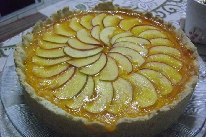 Enquanto isso, a massa deve estar assada. Coloque o mingau nessa massa pronta. A seguir, coloque fatias de maçã, morango ou pêssego e cubra com esse espelho.