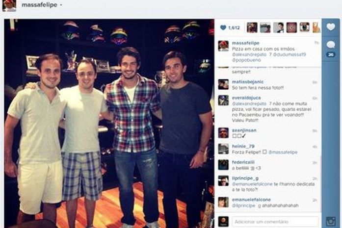 O piloto de Fórmula-1 Felipe Massa, que esteve no Rio de Janeiro na manhã de domingo para uma apresentação especial da Ferrari, em que dirigiu um modelo da escuderia pelas ruas da Cidade Maravilhosa, aproveitou a passagem pelo país para receber um amigo especial para uma pizza.