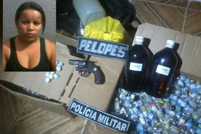 Durante a revista, os policiais encontraram um revólver calibre 32, seis munições intactas, quatorze bombinhas de maconha, dois litros de substância utilizada na produção de loló (clorofórmio), centenas de recipientes vazios de medicação injetável e um recipiente de detergente contendo loló.