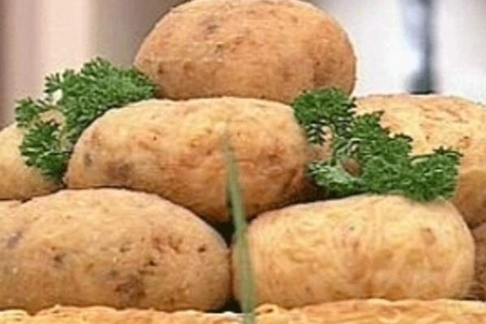 Repita este processo até acabar a massa de macarrão.Retire a massa com o recheio do saco plástico e passe em 3 ovos batidos ligeiramente e temperados com canela em pó e sal a gosto. Empane na farinha de rosca e frite em óleo moderadamente quente (170ºC a 180ºC) até dourar. Sirva imediatamente.