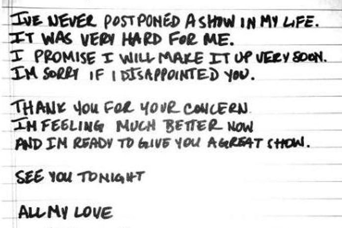 Beyoncé enviou um pedido de desculpas aos seus fãs da Bélgica por meio do Facebook na madrugada desta quarta-feira (14). No recado, escrito à mão, a cantora se desculpa por ter adiado o show que realizaria na cidade de Antwerp nessa terça-feira (13). Leia abaixo: