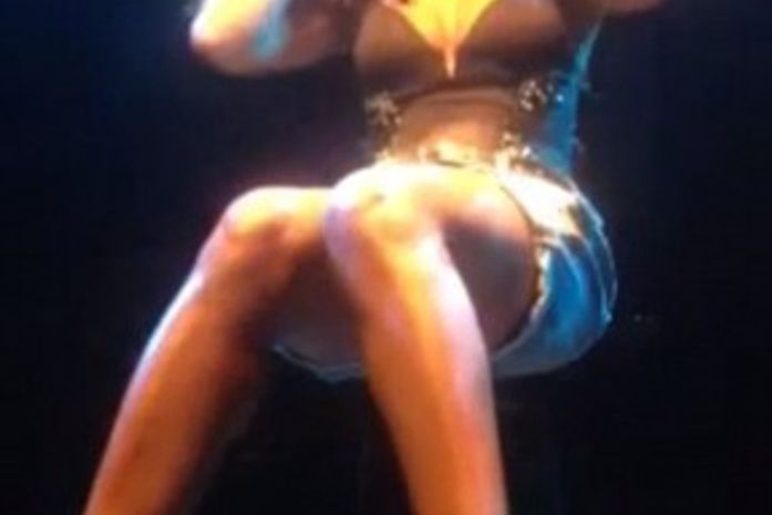 Kelly, então, sentou-se debruçada sobre o palco com os cabelos escondendo o rosto. Ela vestia shorts jeans, um bustiê preto e botas pretas.