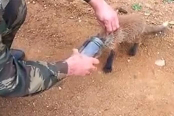 Assim que avista o animal, o homem, que estava fardado, desce e, segurando a raposa pelo pescoço, tira a cabeça do mamífero de dentro do pote. O bicho assustado sai correndo, e um dos homens faz uma brincadeira, e pergunta “onde está o obrigado?”.