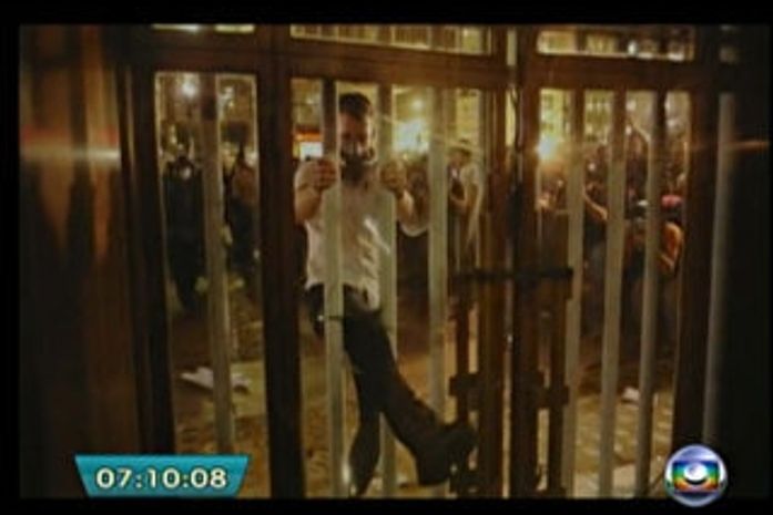 Os guardas-civis entraram e um grupo de vândalos começou a depredar o prédio. O grupo foi para a lateral do prédio e tentou arrombar a porta com um poste de ferro. Pedras quebraram os vidros das janelas. Nas imagens gravadas, é possível ver claramente o rosto de um rapaz de camisa azul. Enquanto isso, outros baderneiros pichavam o prédio. Depois, os vândalos atearam fogo em um carro de reportagem de uma emissora de televisão.