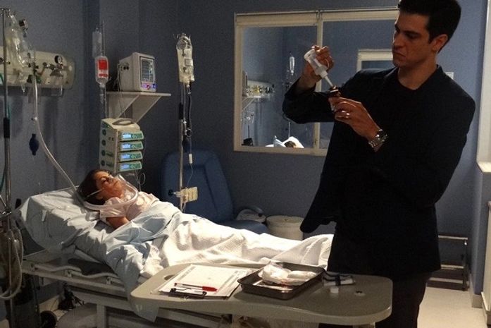 É quando Félix (Mateus Solano) surge, muito solícito, perguntando sobre o estado de saúde da paciente. Ciça, que o respeita o diretor do estabelecimento, responde a todas as perguntas dele, inclusive a de que terá que ministrar o remédio – o que está em cima da mesa – logo mais. Ele, então, dá um jeito de tirá-la do quarto, inventando uma história qualquer.
