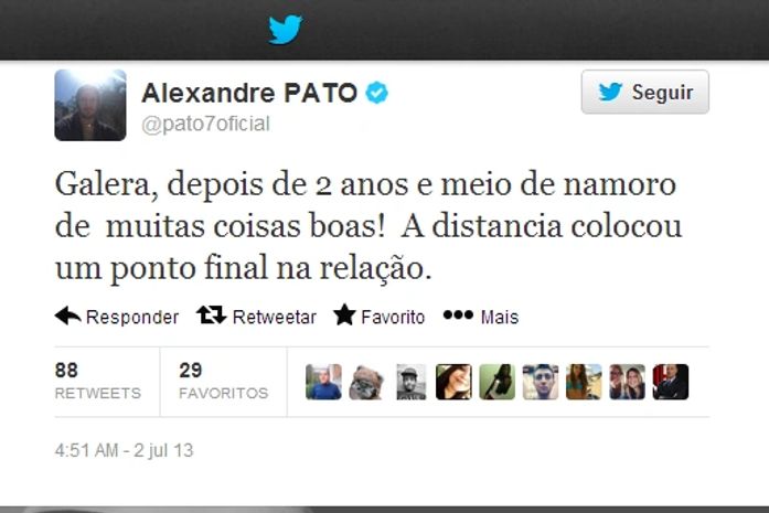 Pato havia usado a mesma rede social há três dias, quando negou a gravidez da ex-namorada. "Pessoal, só para esclarecer não vou ser pai", escreveu ele. Os boatos de que ela estaria esperando um bebê começaram após uma viagem recente para aproveitar uma folga do jogador. Na ocasião, os dois passaram um dia na praia na Itália e uma foto em que ele aparece beijando a barriga da namorada levantou a suspeita.