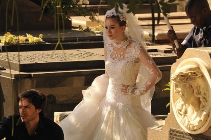 Marina Ruy Barbosa gravou as cenas do enterro de Nicole, em “Amor à vida”, num cemitério do Rio. Como a personagem morre no altar logo depois do seu casamento com Thales (Ricardo Tozzi), ela é enterrada vestida de noiva e sua alma fica vagando, atormentando o marido. Nas sequências, Thales vê a mulher fantasma pela primeira vez, que se mostra decepcionada com o golpe do escritor com Leila (Fernanda Machado).