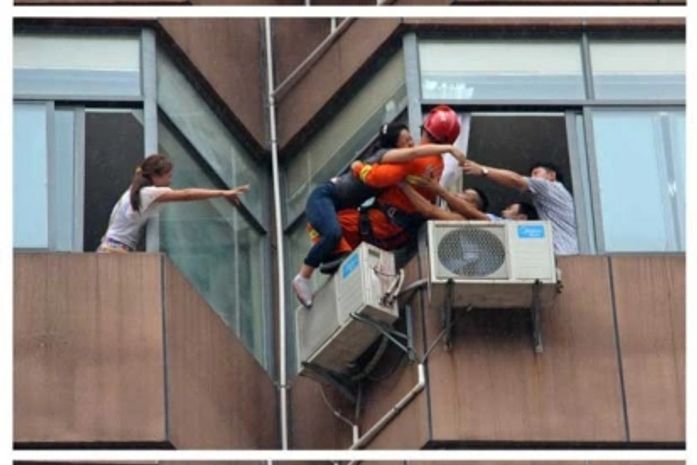 Uma mulher, alegando problemas de relacionamento, tentou se jogar do sétimo andar de um um prédio chinês na segunda-feira (19). Bombeiros foram direcionados para Tongren, província de Guizhou, para fazer o resgate da vítima.