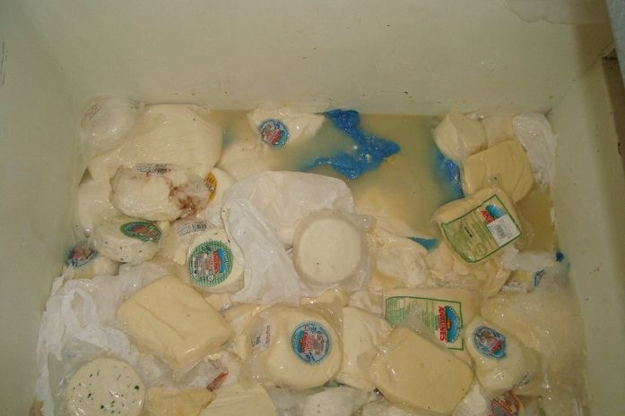 A área de armazenamento e refrigeração também apresentou não conformidades. Dentre elas, estão uma câmara desorganizada com peças de queijo e manteiga mantidos diretamente sobre estrados, alguns sem embalagem e outros sem rótulo; produtos acabados e semi-acabados junto com matéria-prima no mesmo local; ausência de armários ou prateleiras; produtos encostados, uns, nos outros, e nas paredes; 12 tonéis plásticos de cloreto de sódio sendo reutilizados para armazenar creme para fabricação de manteiga, estando alguns destampados e, num deles, havia um pano em contato com o creme e resfriador amarrado com fio elétrico, condensando água e gotejando sobre os produtos.