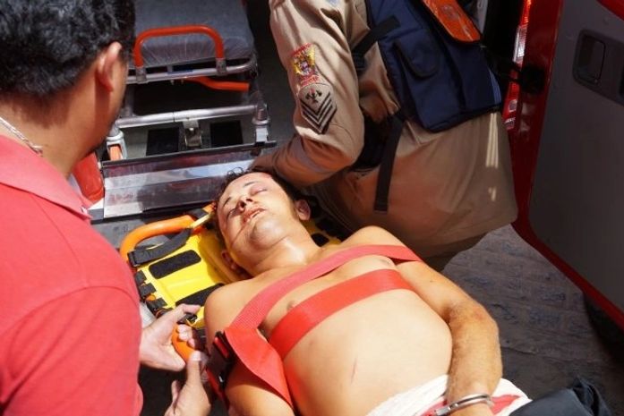 Everton dos Santos, 22, foi socorrido por uma equipe do Atendimento Médico de Urgência (Samu) com o apoio do helicóptero de resgate ‘Arcanjo’, já desacordado. Após o atendimento médico, o acusado teve fratura escapular e politraumatismo craneoencefálico constatado. Segundo a equipe médica o estado de saúde do jovem é instável e ele deve passar por uma cirurgia ainda hoje.