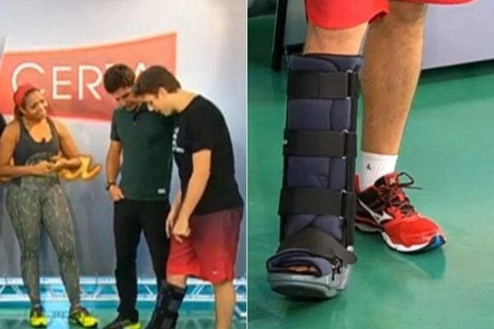 Isso porque o comediante machucou o pé direito e mostrou, no programa do último domingo (17), que está com a perna imobilizada. Aos colegas e ao preparador físico, Márcio Atalla, Porchat explicou: 'Pisei na raiz de uma árvore'.