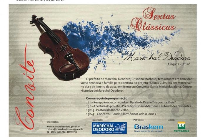A cidade de Marechal Deodoro, no litoral sul de Alagoas, oferecerá aos adeptos da música clássica uma grande oportunidade de programação, a partir do dia 3 de janeiro. O projeto “Sextas Clássicas em Marechal” promete atender o público local, além de outras cidades e Estado, tendo em vista o período de alta temporada.