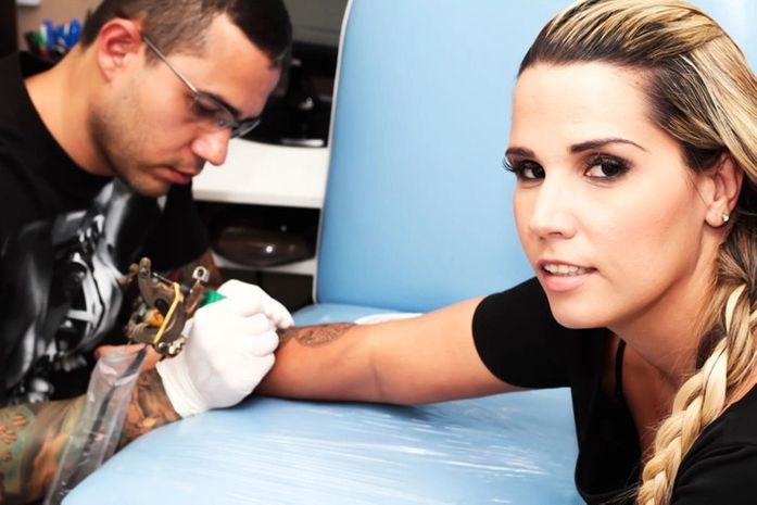 A loura, que já possuía seis tatuagens, tatuou outras três de uma só vez. Em uma das mãos escreveu divã nos dedos e na outra escreveu a palavra funk.