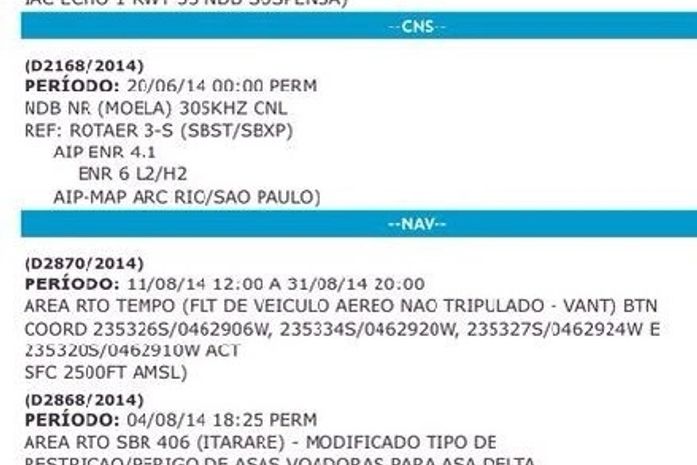 Um alerta sobre informações de pousos e decolagens, chamado de Notice to Airman (Notam), entregue aos pilotos com o plano de voo, informava à tripulação da aeronave que levava a comitiva de Eduardo Campos a Santos (SP) sobre a existência de uma área próxima à base aérea da cidade destinada a veículos aéreos não tripulados (Vants).