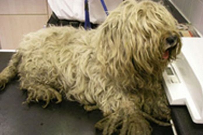 Um cão foi encontrado com o pelo sujo e emaranhado em uma avenida em Goldthorpe, no Reino Unido, e acabou "careca" após ter pelagem raspada.