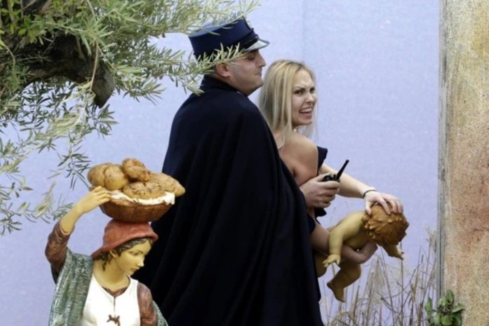 Enquanto o Papa Francisco fazia suas orações de Natal para mais de 80 mil fiéis, e lembrava as crianças que sofrem maus-tratos ou violência, uma manifestante do grupo ativista Femen invadiu um presépio em tamanho natural montado na Praça São Pedro e tentou sair com a estátua do menino Jesus.