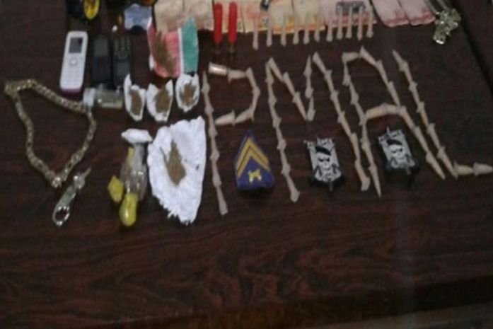 Com o acusado a polícia encontrou uma certa quantidade de maconha, 84 pinos de cocaína, R$ 340 em espécie, alguns cartuchos de espingarda calibre 12, além de aparelhos celulares, corrente de prata e óculos esportivo sem origem comprovada.