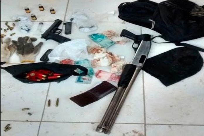 Conforme a PC, foram apreendidos uma escopeta calibre 12, uma pistola .40, várias munições, luvas, balaclava, celulares e dinheiro.