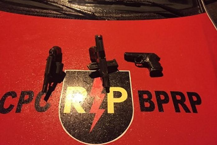 Além disso, com o grupo, foram apreendidos um revólver calibre 38, sem munições; uma pistola Taurus, com cinco munições intactas; e uma arma de brinquedo, além de dois monitores e sete aparelhos celulares.O grupo tinha acabado de roubar uma pizzaria e se preparava para roubar outro estabelecimento comercial.