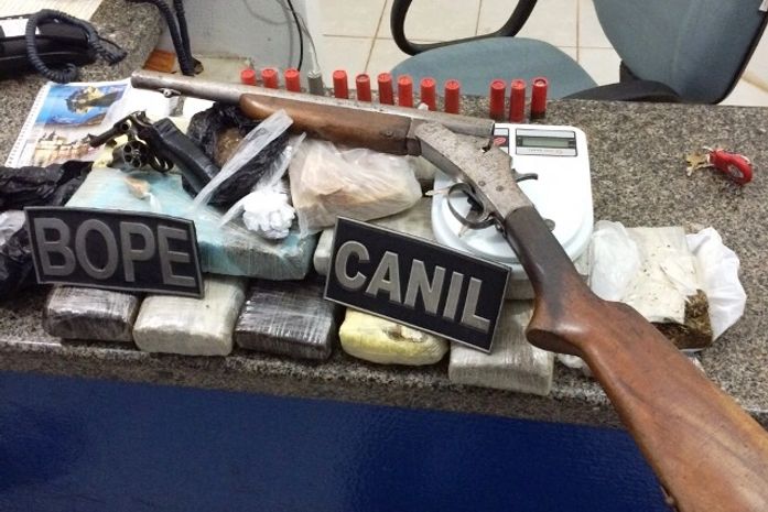 No total, foram apreendidos quase dez quilos de maconha, 500 gramas de crack, uma balança de precisão, uma espingarda calibre 12 com 13 cartuchos, um revólver calibre 32 com cinco cartuchos, quatro aparelhos celulares, uma pequena quantia em espécie e uma motocicleta modelo Dafra de cor vermelha, pertencente a Carioca.