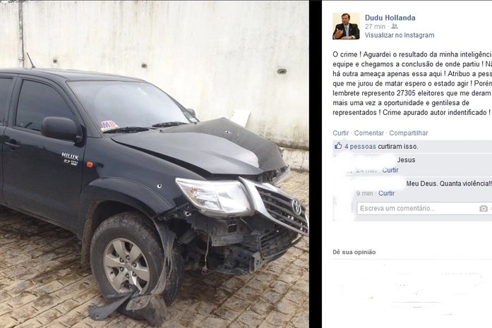 Hoje, mais uma novidade. O deputado estadual relatou em suas redes sociais que foi vítima de um atentado. Seu veículo teria sido atingido por disparos de arma de fogo. Há até cópia de Boletim de Ocorrência, como mostra reportagem do CadaMinuto. Hollanda acusa Bruno Casado.