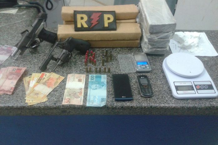 De acordo com a Polícia Militar, foram apreendidos quase 10 quilos de maconha, 298 gramas de cocaína, uma balança de precisão, além de uma pistola calibre 9 mm e um revólver calibre 38.