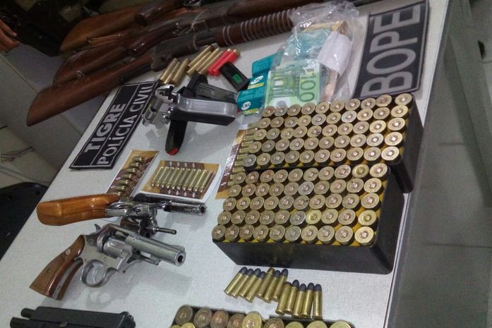 Mais de 500 munições de diversos calibres foram apreendidos com o grupo, além de cinco revólveres calibre 38, uma pistola glock 380, uma pistola 9mm, três espingardas de calibre diferentes (20, 22 e 12, sendo esta automática) e uniformes da Polícia Civil R$ 7.600 em espécie, R$ 7.150 e 600 euros.