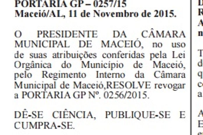 O presidente da Câmara Municipal de Maceió (CMM), vereador Kelmann Vieira (PMDB), publicou na edição desta quinta-feira, 12, do Diário Oficial do Município, a portaria de 0257/2015, revogando a portaria anterior, onde autorizava a concessão de três diárias a vereadora Tereza Nelma, para que ela participasse do evento PSDB/Mulher, em São Paulo.