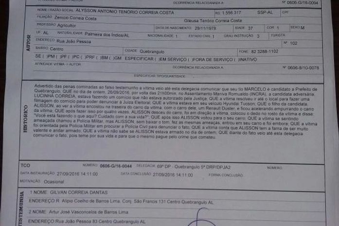 Carlos Henrique, sobrinho de Marcelo Lima, foi ameaçado por Alisson enquanto colhia provas de um descumprimento da lei eleitoral por parte da chapa de Lucinha. A referida chapa realizava um evento que havia sido proibido pela juíza eleitoral, no dia 8 de setembro.