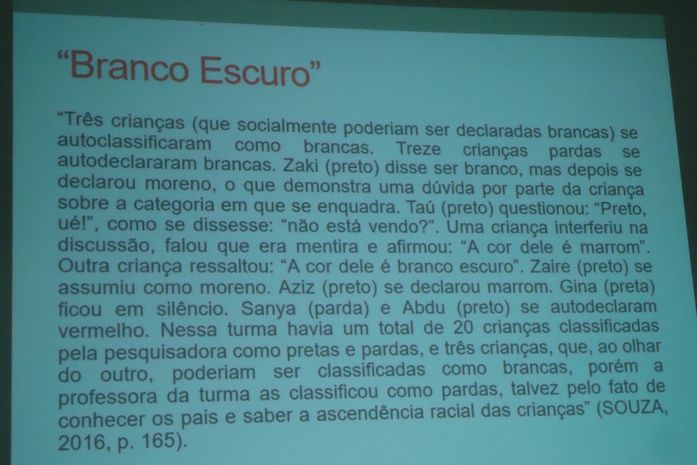 Uma criança interferiu na discussão e afirmou:- A cor de Taú é marrom. Outra criança ressaltou: a cor dele é branco escuro. Zaire (preto) se assumiu como moreno. Aziz (preto) se declarou marrom.
