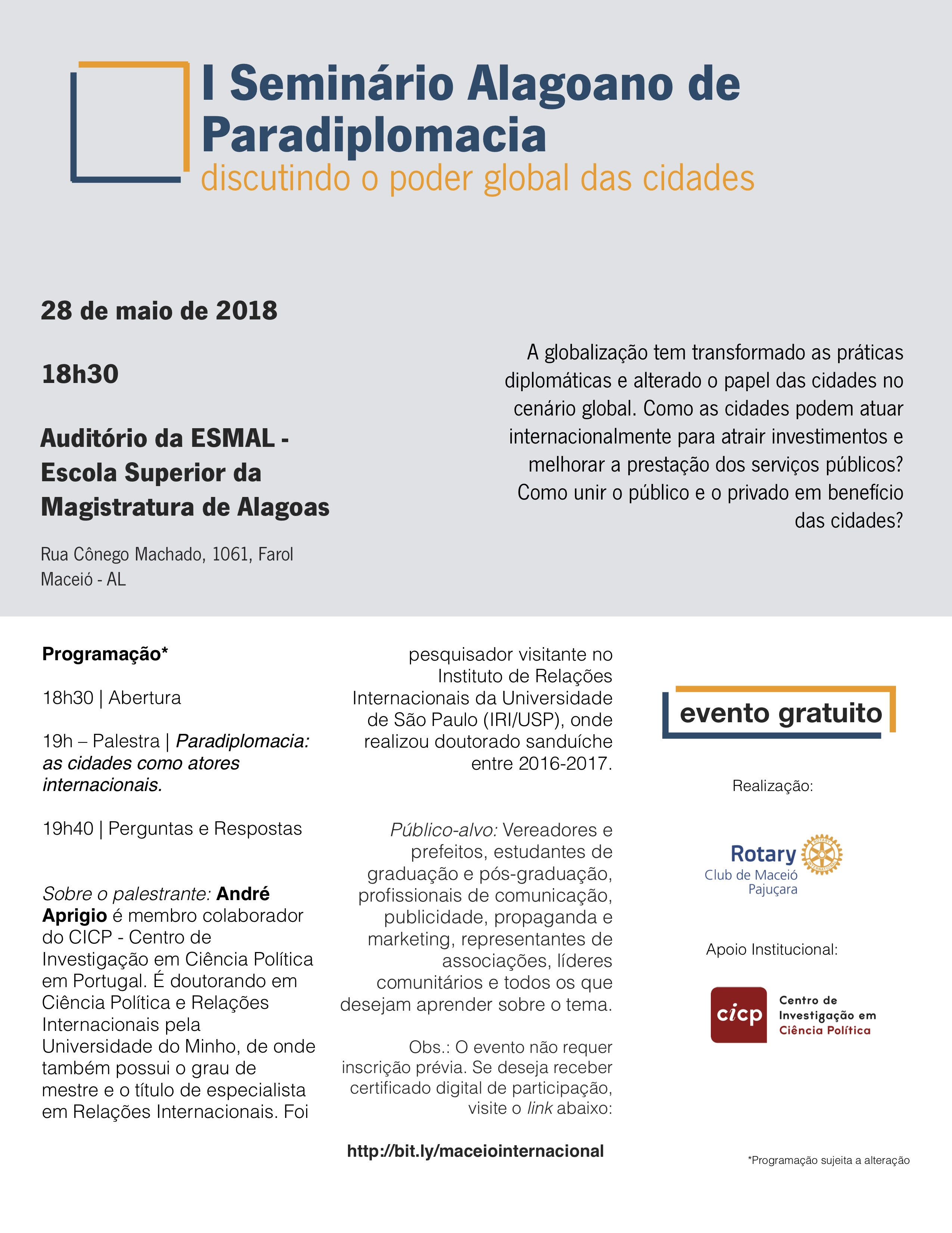 O Rotary Club de Maceió – Pajuçara promoverá, como parte das comemorações do seu primeiro aniversário, o I Seminário Alagoano de Paradiplomacia: discutindo o poder global das cidades no próximo dia 28 de maio, a partir das 18h30, no auditório da ESMAL.