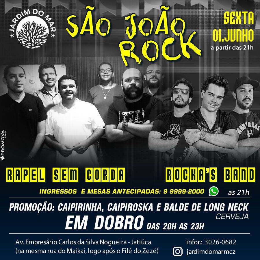 A sexta-feira (1 de junho) será de muito pop rock no Jardim do Mar, na Jatiúca. A Rapel sem corda e a Rocka’s band se apresentam no São João Rock, a partir das 21 horas. Os ingressos podem ser adquiridos antecipadamente.