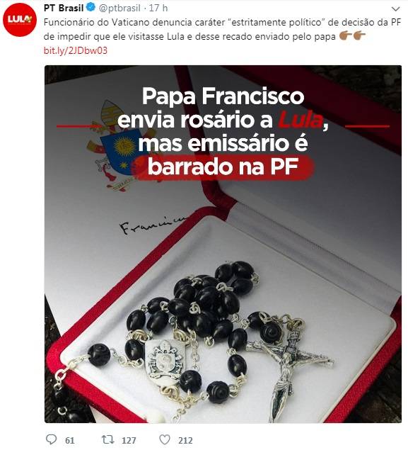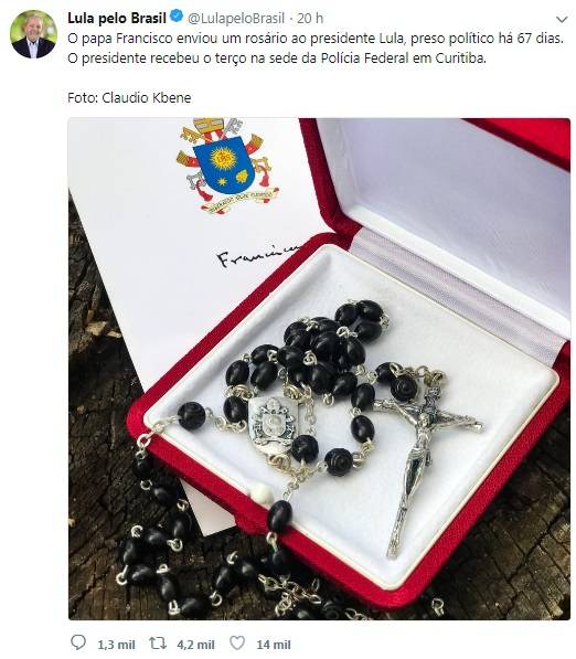 Na noite desta segunda-feira, o perfil do ex-presidente no Twitter havia publicado que “o papa Francisco enviou um rosário ao presidente Lula, preso político há 67 dias. O presidente recebeu o terço na sede da Polícia Federal em Curitiba”.