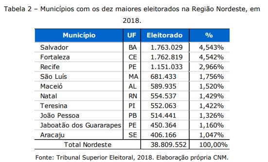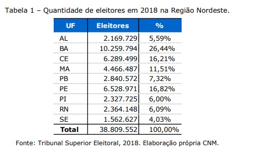 Como evidenciado pela tabela 1, o Estado com maior número de eleitores é a Bahia, com um eleitorado de 10,2 milhões, correspondendo a 26,44% do total. O Pernambuco, em segundo lugar, possui 6,5 milhões e consiste em 16,82% do total.