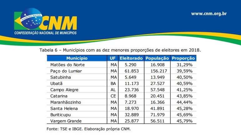 O estudo levantado pela Confederação apontou os municípios com o maior eleitorado e o número de cidades que possuem mais eleitores que habitantes. Para tanto, foram utilizadas as estatísticas do Tribunal Superior Eleitoral (TSE), divulgadas em 31 de maio de 2018.