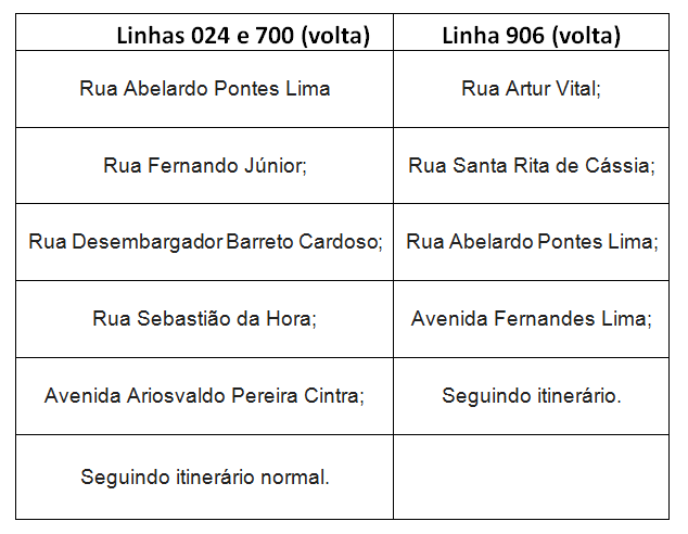 As linhas que terão o itinerário modificado são a 024 (Sanatório/Centro), 700 (Sanatório/Ponta Verde) e a 609 (Vila Saem/Iguatemi), todas no sentido de volta.