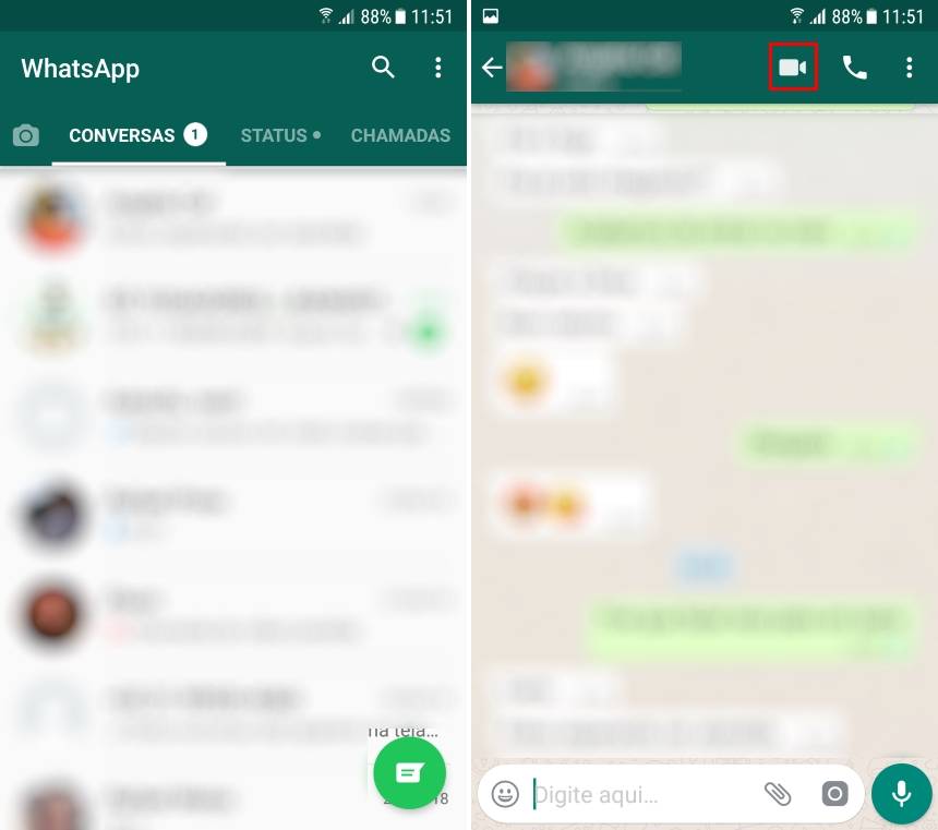 1. Na tela inicial do Whatsapp, selecione um dos contatos a fazer parte da chamada e clique no ícone conforme mostra a imagem abaixo para iniciar uma chamada de vídeo;