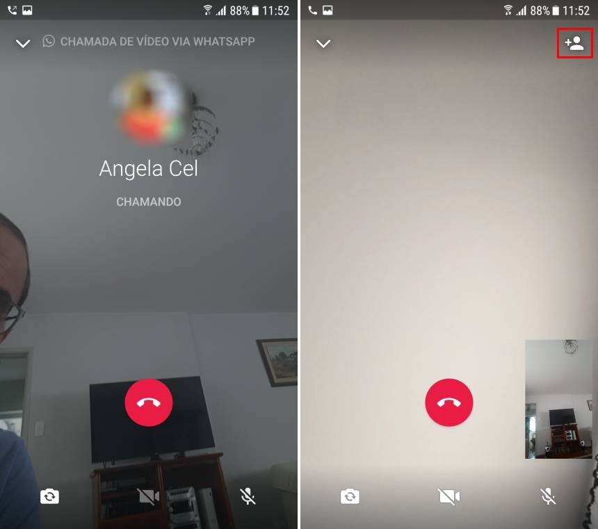 2. Espere o contato aceitar a chamada e clique no ícone localizado no canto superior direito da tela, representado por uma pessoa com o sinal de “+”;