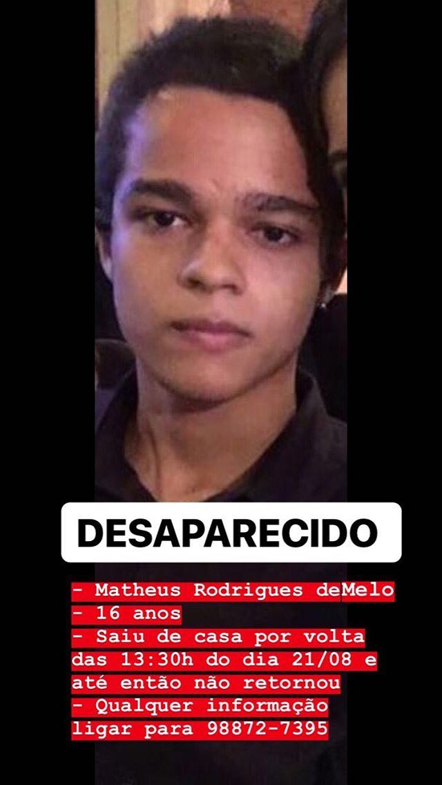 A família de Matheus Rodrigues de Melo, 16 anos, está aflita a procura do jovem que está desaparecido desde a tarde desta terça-feira (21), quando saiu de casa por volta das 13h30, no bairro da Santa Lúcia, parte alta de Maceió.