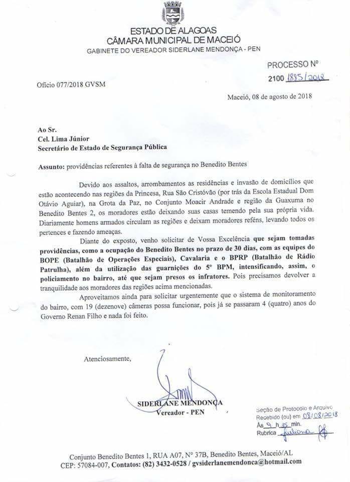 O vereador Sirdelane Mendonça, postou em suas redes sociais, um requerimento enviado a Secretaria de Segurança Pública (SSP) solicitando uma ocupação das forças policiais no bairro para intimidar a circulação dos criminosos armados.