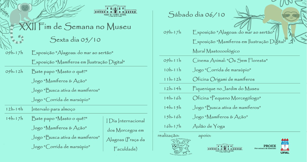 Os mamíferos irão invadir a 22ª edição do Fim de Semana no Museu, que acontece nesta sexta-feira (5) e sábado (6). O evento promovido pelo Museu de História Natural (MHN) da Universidade Federal de Alagoas (Ufal) trará atividades que abordarão a importância e características destes animais, além do 1º Dia Internacional dos Morcegos em Alagoas, na sexta.